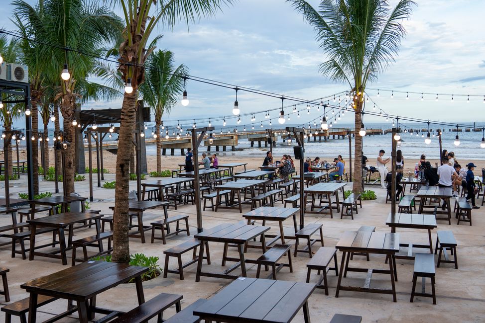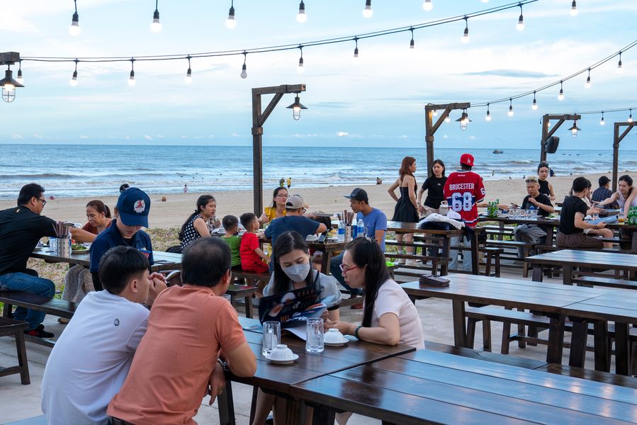 Nhà hàng sử dụng chất liệu gỗ và mây sẽ tạo ra một không gian ấm cúng, gần gũi với thiên nhiên, kết hợp với cửa kính lớn và cửa sổ rộng hướng ra biển.